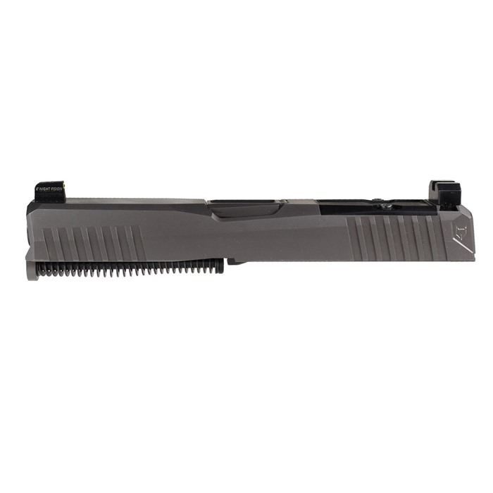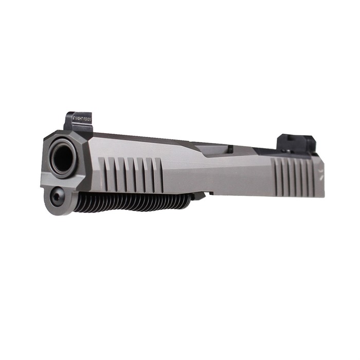 Fram- och bakserreringar på sliden ger enkelhet vid laddning och press-check. Sliden är reflexsiktsklar med DUSK19 optikskyddsplatta inkluderad, som är kompatibel med både Trijicon RMR/SRO och Holosun 407/507/508 (Non-K-modeller). Dessutom inkluderar denna slide en ? co-witness eller dämpad höjd Night Fision Stealth Series sikte med en Tritium-insert för klar sikt från skymning till gryning.
