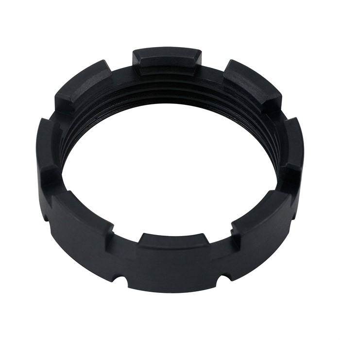 Den patentansökta EZ castle nut är tillverkad av premium 4140 PH legerat stål och är ytbehandlad med långvarig, diamant-hård svart nitride. Den har precisionsbearbetats på en modern schweizisk CNC-lathe, till toleranser som uppfyller eller överstiger mil-spec TDP, inklusive äkta klass 3-gängor.