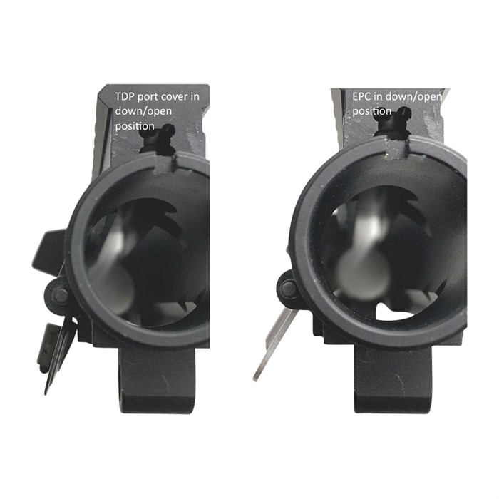 - EPC har två "flikar" som flankerar utskärningen för port cover-fjädern. Dessa flikar gör att EPC kan vila på överdelen i en större vinkel när den är nedfälld/öppen, vilket ger mer utrymme mellan port cover och nedre mottagare.
