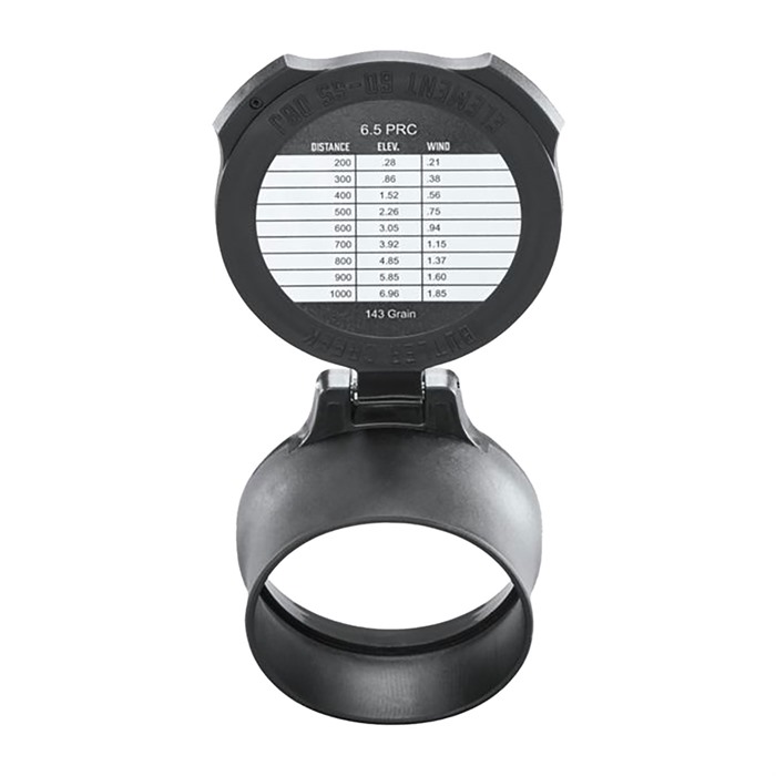 The Butler Creek Element Scope Caps are highly rugged with a multi-flex sleeve. The objective flip out printable dope disk provides wind and elevation information.