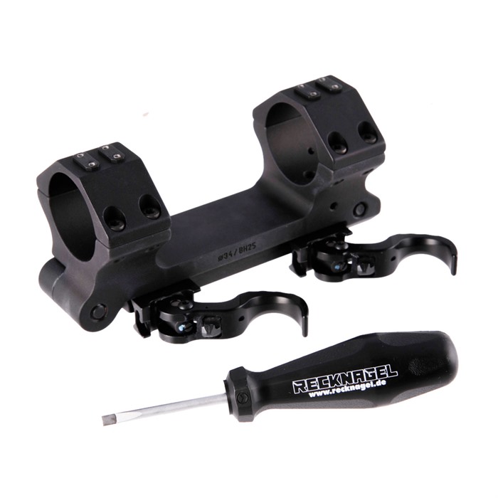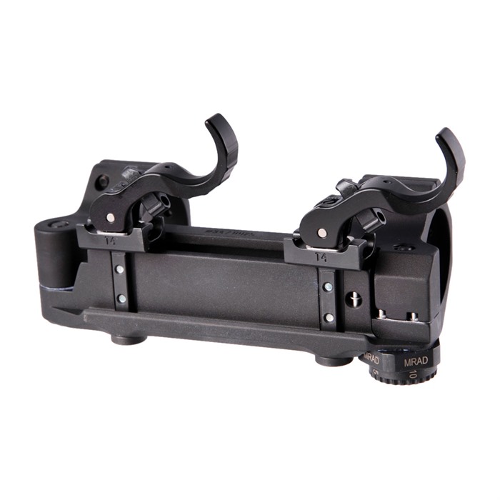 New GEN-2 with lightweight lever or nut system. Up to 7% lighter. Often the range of elevation adjustment of the scope in not the adequate to compensate for the bullet drop at long ranges. This scope mount was developed to offset the missing adjustment range of the scope. The inclination of the scope mount can be adjusted individually in steps of 10 from 0 – 70 MOA. The mount and the rifle scope can remain on the rifle. Self-locking thread inserts ensure permanent and stable seating of both bolted connections. Eratac guarantee 100% repeatability and shot strength. The upper and lower part of the mount are securely connected to each other by a screw running across the hand wheel diagonally. The hinge is designed as a solid tapered joint and ensures play-free seating of the components. NEW: The mount is now also supplied with a dial in mrad/MIL. The inclination can be changed in steps of 5 between 0 – 20 mrad/MIL. A Dozen Reasons for ERATAC Mounts: Machined from solid high-grade aluminum Hard anodized, matte black Made acc. to Mil-Spec. Type III Rust-proof components 100% repeatability Immediate return to zero! Tested up to cal. .50 BMG Available in many heights for different weapons and scopes With or without inclination for long-range shooting Rings with UNIVERSAL interface for attaching various tactical accessories Clamping system manufactured acc. to NATO-STANAG 4694, compatible with Mil-Std. 1913 Locking by either safety levers or hexagonal nuts without losable parts 100% made in Germany