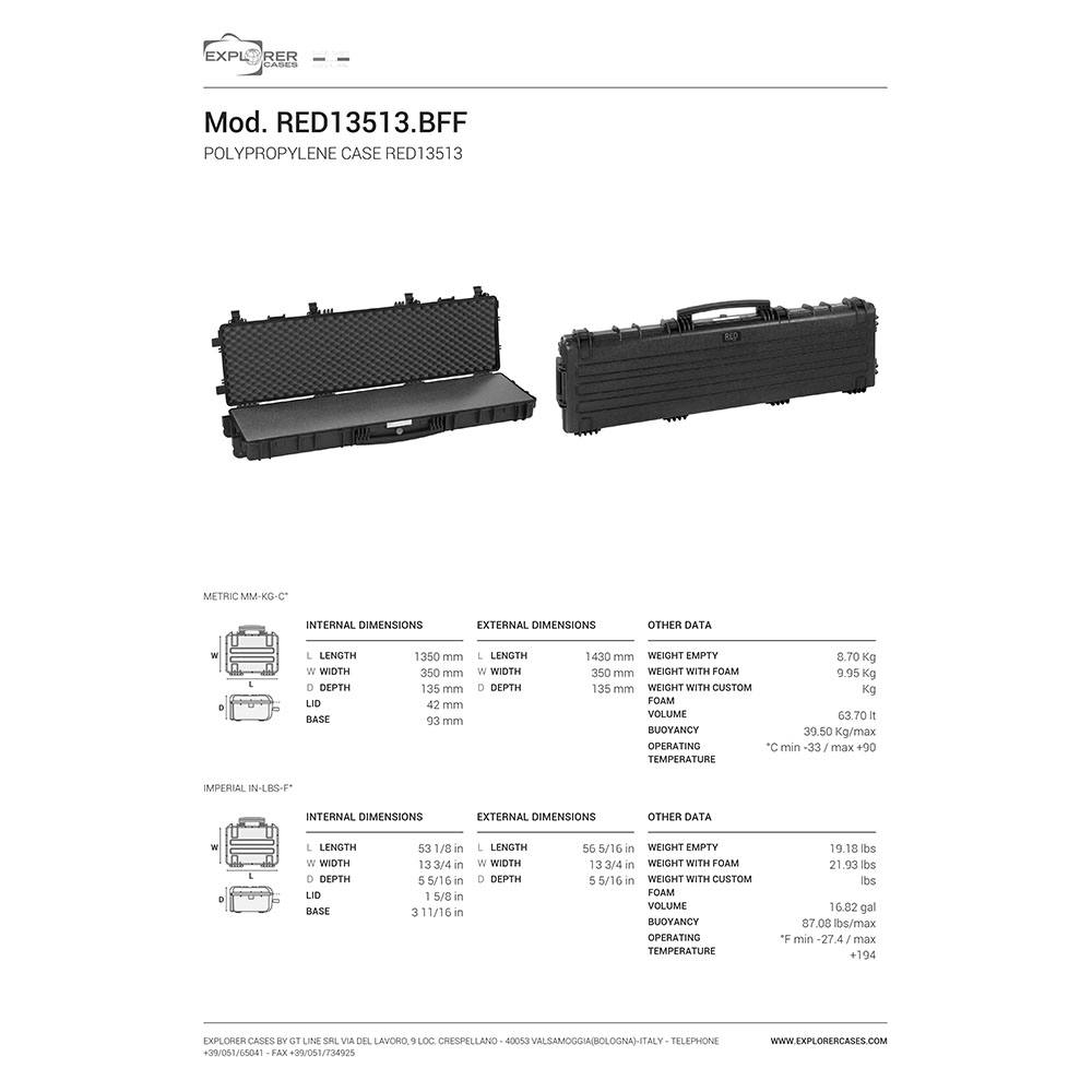 8024482183664 The best protection for your most precious baby - The ultimate weapon case with a variety of functions in the highest quality, manufactured by Explorer Cases in Italy. Specs: Length: 1430mm (1350mm inside) Width: 350mm (350mm inside) Depth: 135mm (135mm inside) Weight: 9,95kg (8,70kg without inlay) Color : Black Inlay: Density Full Foam Literally indestructible The weapon cases from Explorer Cases each have corrosion proof metal hinges with lid stay features, which fixate the cover and hold it into place when opened. So you can rest assured that your weapon cases will assist you a long long time. Thanks to the locking latches the weapon cases are always highly secured. The O-ring gasket also makes them water resistant to a great extend. Every weapon case is equipped with a manual air pressure release valve. Therefore you can take it easy and will have no problem handling and closing the case. Exactly how you want it The cases are provided with internal cutouts for optional internal brackets or mounting rings, so you can store everything exactly as it is most suitable for your requirements. Every single suitcase comes with a waterproof removable label with which you can label your equipment or store your data. The case can either be transported traditionally via the large front handle or via optional shoulder straps, which can be easily attached to any model. The Mod Red 13513 series can also be used as trolley case.