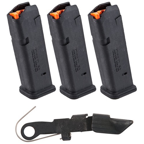 The PMAG 17 GL9 is a 17-round magazine featuring durable polymer construction, paint pen dot-matrix for labeling, tool-less floor plate removal for ease of maintenance, and a visible capacity indicator hole on the body. The PMAG 17 GL9 is compatible with all full-size 9mm Glock handguns, as well as compact and sub-compact variants with some protrusion below the grip. Drop-in replacement for factory slide release lever has a much larger finger pad and a trapezoid-shaped bump that help ensure you release the slide fast, on the first try, after a reload. Saves precious seconds that can be lost making multiple swipes to release the slide and chamber the next round. Low profile and smooth contours will not affect holster fit or snag on clothing. Rugged, all-steel construction; matte black finish matches Glock factory finish. Separate models to fit current-production 3-Pin and early 2-Pin pistols