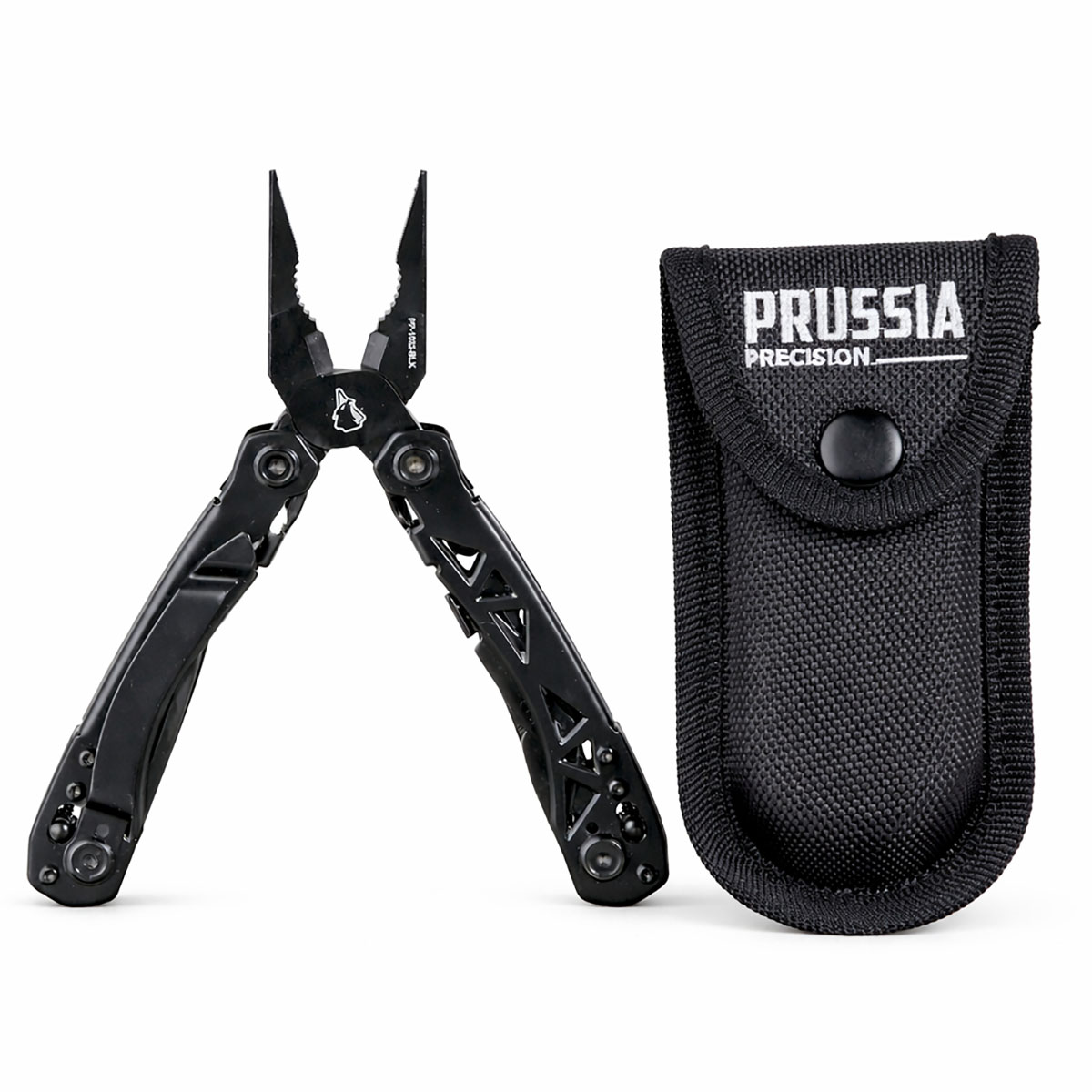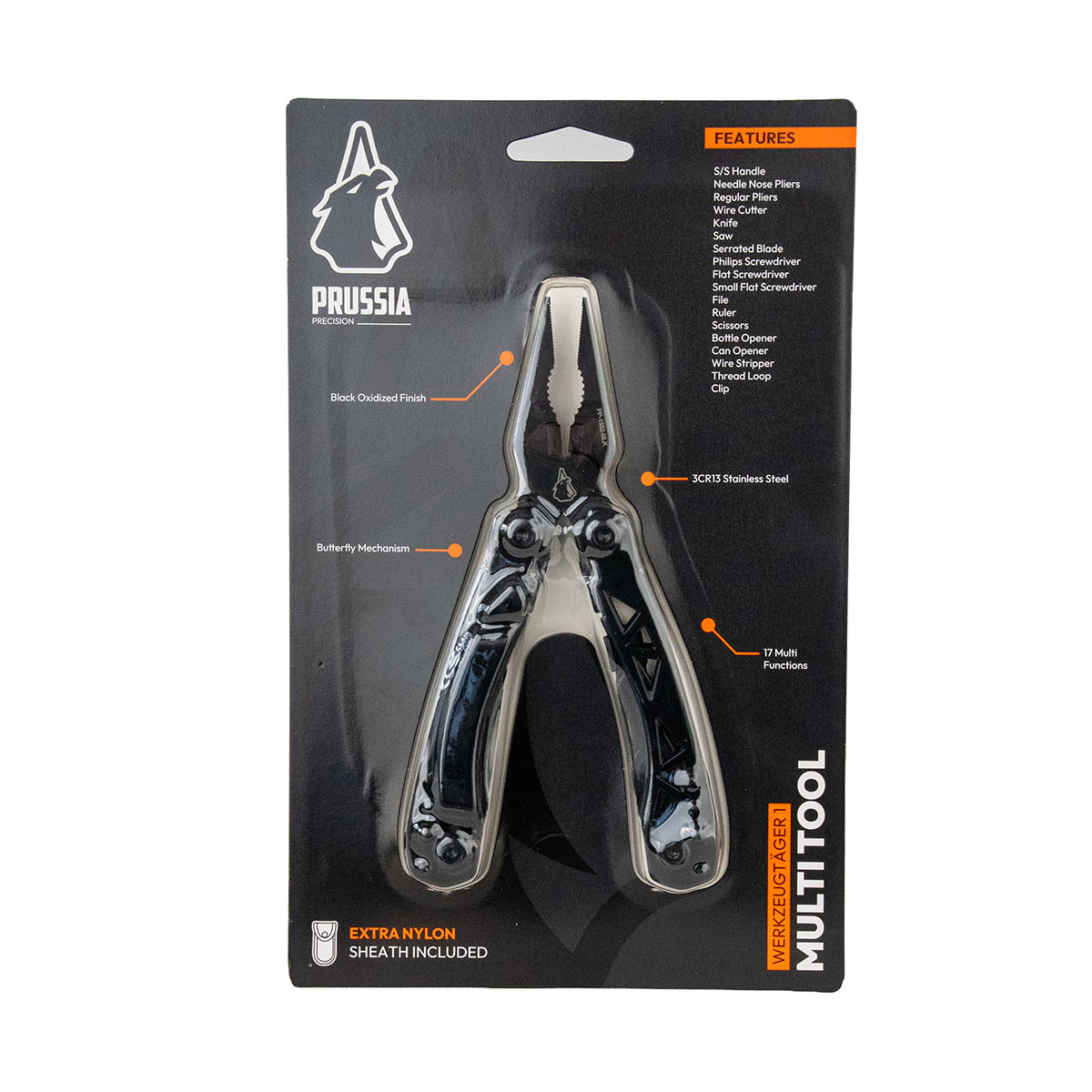 726529840803 The Prussia Precision Werkzeugträger 1 is a rugged and versatile multitool designed for everyday utility, outdoor use, and practical field tasks. Built to combine essential tools into one compact and reliable platform, it delivers dependable performance wherever a full toolbox is out of reach. Constructed from durable 3Cr13 stainless steel and finished with a protective black oxidized coating, the Werkzeugträger 1 offers solid corrosion resistance and a clean, functional appearance suited for demanding environments. Its proven butterfly mechanism ensures smooth handling and quick access to the integrated tools. With 17 functions, it covers a wide range of everyday needs, including needle nose pliers, regular pliers, wire cutters, knife and serrated blade, saw, scissors, screwdrivers, file, ruler, bottle opener, can opener, wire stripper, and additional utility features such as a thread loop and carry clip. Compact, durable, and built for real-world use, the Werkzeugträger 1 delivers Prussia Precision functionality in a clean, no-nonsense multitool format.Leveranstid ca. 4-10 dagar.