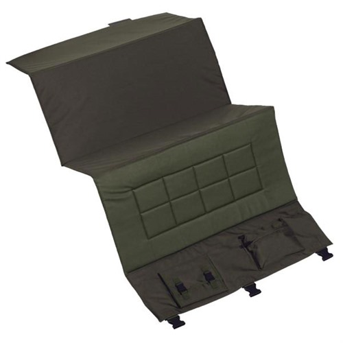 Thick padding, which makes it very COMFORTABLE. LARGE size, a Zippered POCKET for brass and a window for your drop/wind dope sheet. Then when your done shooting it folds into an easily carried package with it's own carrying sling.