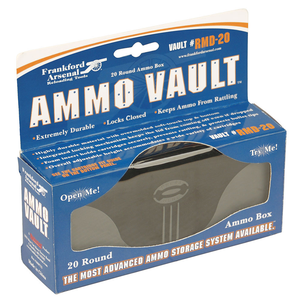 661120126003 Frankford Arsenal® Ammo Vault® tar ammunitionlagring och transport till en helt ny nivå. Genom att kombinera hållbara, stötresistenta material och en innovativ låsdesign erbjuder Ammo Vault® oöverträffat skydd för dina gevärskartuscher. Inga fler skrammel, inga fler gummiband, inga fler spruckna och trasiga lådor. Ge din ammunition det skydd den förtjänar. RMD-20 passar ammunition från 222 Rem till 30-06.Utgått från tillverkaren