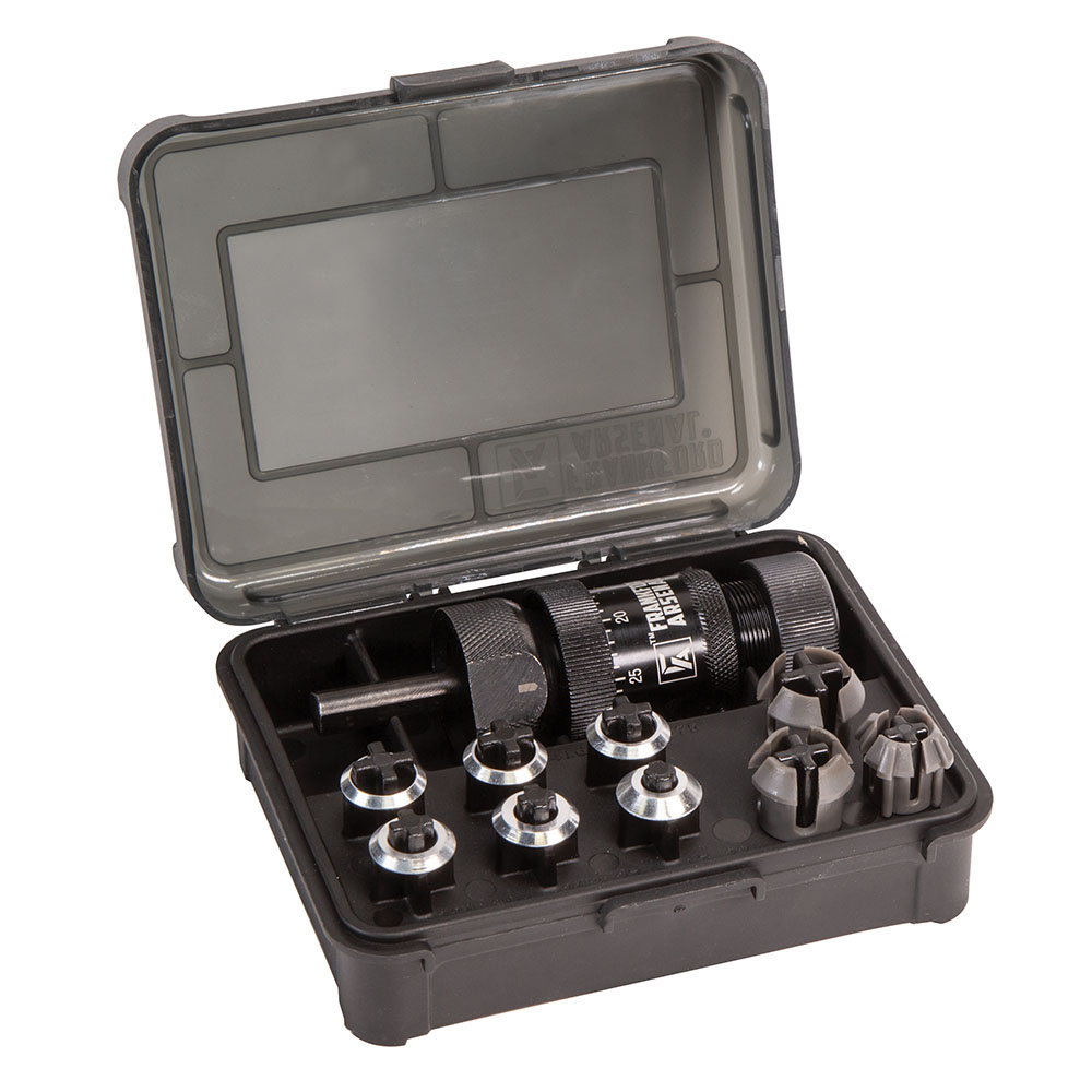 661120416746 • Justerbart colletsystem som fungerar med alla axlade hylsor från .17 Remington till .460 Weatherby • Fungerar med nästan varje 1/2" borr eller bormaskin • Hög hastighet, härdat rostfritt stålskärare som förblir vass i tusentals skott • Mikrojusterbar • Universellt skärsystem som indexerar på hylsaxlar för exakt trimning varje gång - inkluderar en förvaringslåda som rymmer collets och kragar