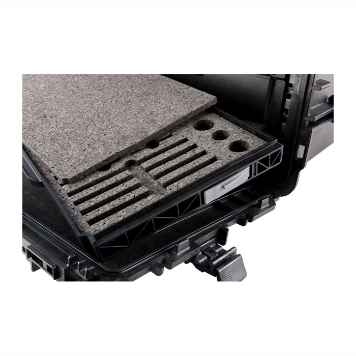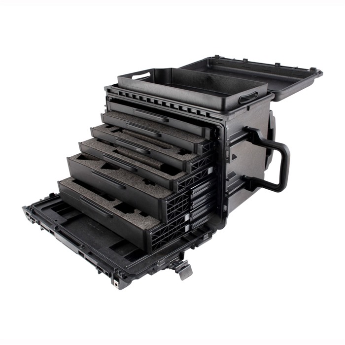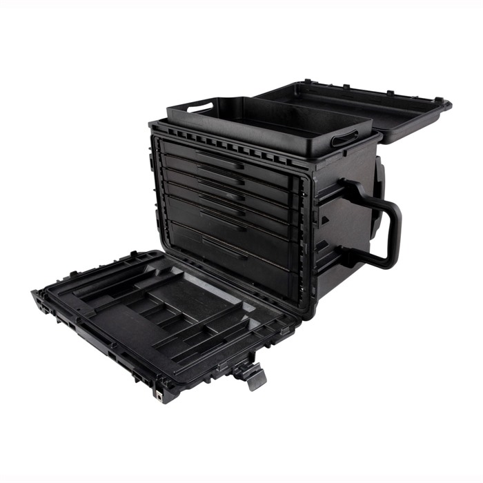 Brownells Armorer’s Tool Chest från Pelican har uppdaterats för att vara ännu tuffare och mer användarvänlig. Den nya verktygslådan har nu ett aluminium railsystem där varje fack glider ut i en säker position för enkel åtkomst till dina verktyg och kan enkelt tas bort för omplacering eller rengöring.