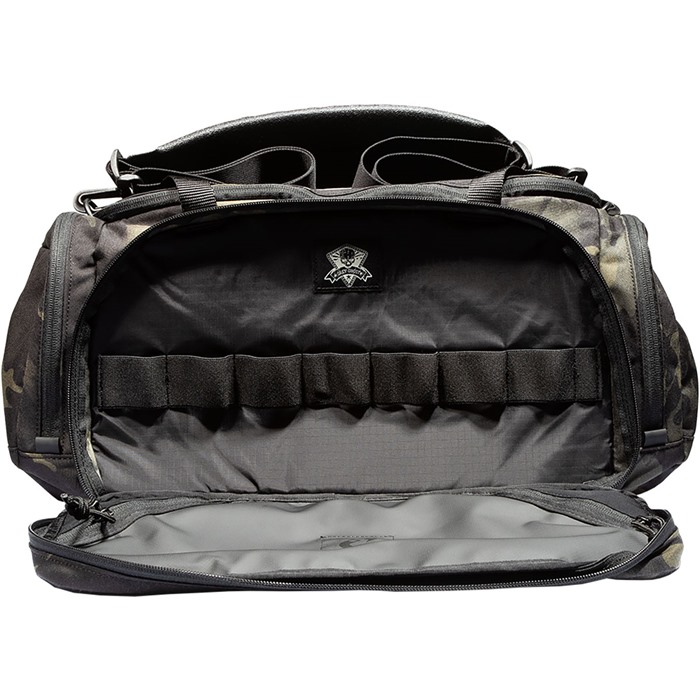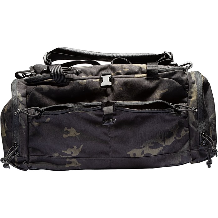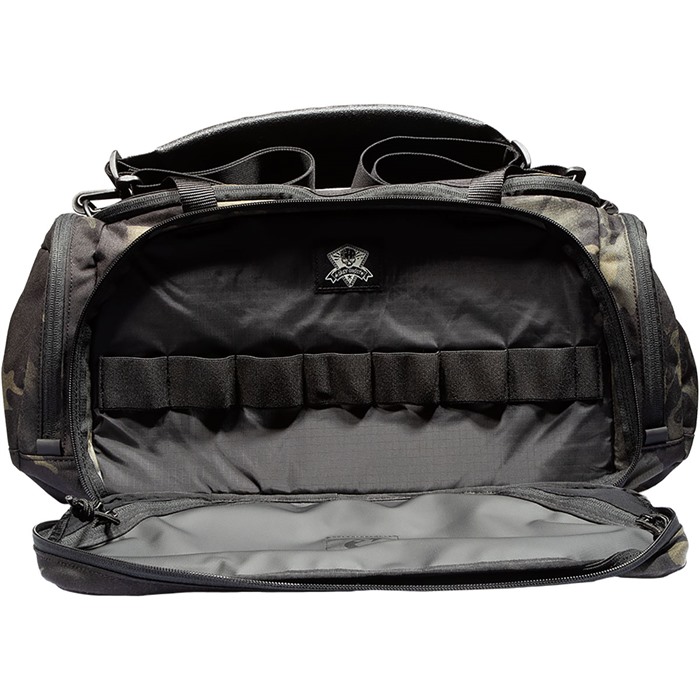 The Grey Ghost Gear™ Range Bag will get you to the range with the kit that you need for a day on the range and keep it organized and handy. The bag measures 9 inches tall, 20 inches wide, and 7 inches deep. 1260 total cubic inches. It is constructed of 500D nylon Cordura. The strap is generous, padded and contoured to stay on the users shoulder when they have their hands full. It features full adjustability and is easily removed by disengaging the side release buckles on either side. On either end there are zippered pockets sized to contain folded electronic ear pro, range finders, staple guns, or your lunch. On the front of the bag is a zippered pouch that will allow the front to fold out to a handy workstation. Two zippered diagonal pockets are perfect for allen keys and other small tools, while the interior wall is outfitted with elastic loop for magazine and or tool storage. The fold down flap is covered with vinyl to make a workspace that can stand up to oil and solvents used in cleaning and lubing your weapon. The real hero is the rare earth magnet sewn into the middle of the work area that will draw small metal pieces to it, like grip screws, to keep them from walking off. On the reverse side of the bag there is a flap pocket to accept a gun rug, targets and the like. Two exterior zippered pockets are ideal for score cards, batteries, or range snacks. The interior of the main compartment is lined with hook and loop material, so you can configure the customizable divider and the removable mesh dump pouch for you brass hounds out there. The lid has mesh storage on the underside for even more organization of shooting supplies. The bottom of the bag has non-skid feet and webbing to reinforce the bag.