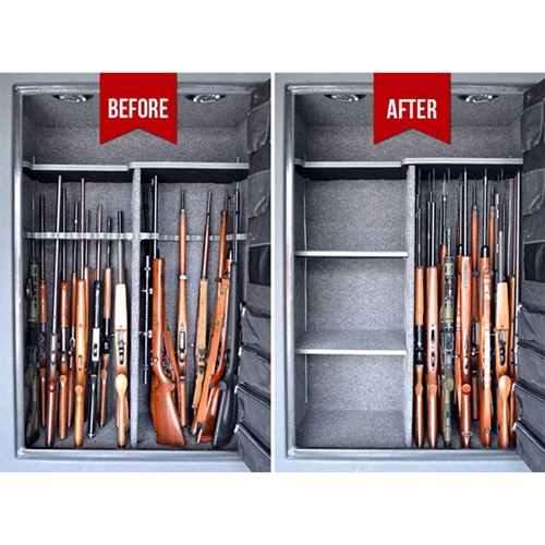Tänker du att ditt vapenskåp är fullt? Tänk om! Nu kan du lagra fler vapen och få enklare åtkomst till dem. Ta bort den standard plywoodhyllan i ditt skåp och ersätt den med Rifle Rods. Gun Storage Solutions amerikanska Rifle Rods stabiliserar varje långvapen individuellt i upprätt läge, istället för lutande, vilket ger mer mångsidighet.