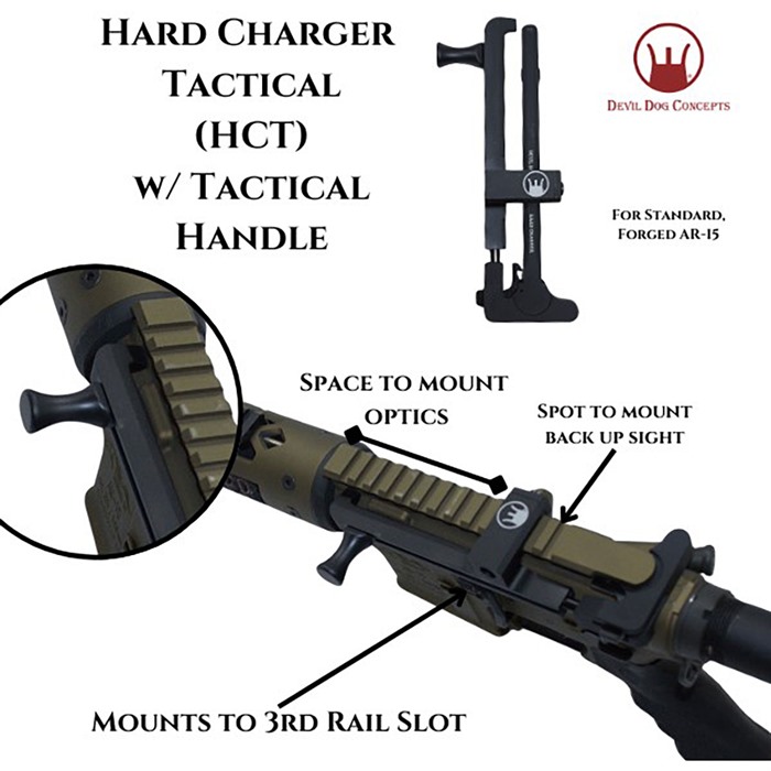 DEVIL DOG CONCEPTS HARD CHARGER TACTICAL SIDE-CHARGE HANDLE W/TACTICAL PULL HANDLE FOR AR-15 Hard Charger® Tactical with Tactical Handle - for Standard Forged, Mil-Spec AR-15/M4 Rifles No longer do you have to rebuild your upper receiver or buy a new rifle to have the side charging capability!! Turn your rifle in to a Side Charger without having to rebuild or modify it. Simply swap out the charging handle and install the Hard Charger. Takes a minute or less and you are up and running! FEATURES Devil Dog Concepts’ Side Charging Handle System = Ergonomically Beneficial Multiple Ways to Charge Interchangeable from Rifle to Rifle Non Reciprocating Removes Stress on Roll Pin Reduces Torque on Charging Handle Field Strippable – Gross Motor Skills Plenty of Room for Mounting Optics and Sights The HCT (Hard Charger® Tactical) Mounts to the 3rd Picatinny Rail and is designed to work on Standard, Forged, Mil-Spec Type Upper Receivers. This design mounts between a Back Up Sight and a forward mounted Optic. Not designed for Billet Rifles including Aero M4E1 SPEC For Standard, Forged Flat Top AR-15s Made from 7075 Aluminum Anodized Black, and Steel Weighs 6ozS 5 year manufacturer warranty. U.S. Patent No. 9,746,263 U.S. Trademark Reg. No. 5,354,510