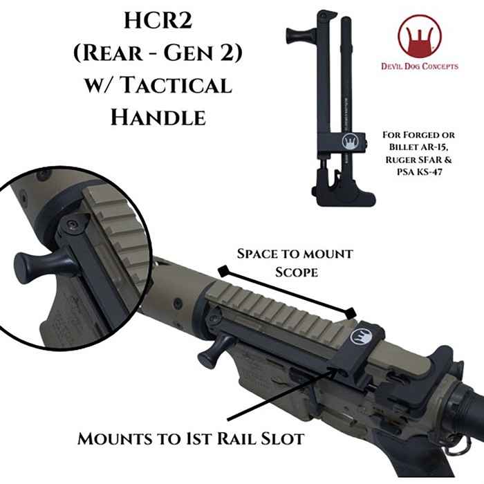 DEVIL DOG CONCEPTS HCR2 G2 HARD CHARGER REAR SIDE CHARGING HANDLE W/TACTICAL PULLING HANDLE FOR AR-15 HCR2 (Hard Charger® Rear – Gen 2) with Tactical Handle: for AR-15 Forged/Billet, SFAR & KS-47 No longer do you have to rebuild your upper receiver or buy a new rifle to have the side charging capability!! Turn your rifle in to a Side Charger without having to rebuild or modify it. Simply swap out the charging handle and install the Hard Charger. Takes a minute or less and you are up and running! FEATURES Devil Dog Concepts’ Side Charging Handle System = Ergonomically Beneficial Multiple Ways to Charge Interchangeable from Rifle to Rifle Non Reciprocating Removes Stress on Roll Pin Reduces Torque on Charging Handle Field Strippable – Gross Motor Skills Plenty of Room for Mounting Optics and Sights The HCR2 (Hard Charger® Rear Gen 2) Mounts to the 1st Picatinny Rail. This new model is designed to work on Standard, Forged, Mil-Spec Type Upper Receivers & Billet Rifles. Will also work on Ruger SFAR & PSA KS-47 This design mounts to the first slot allowing for scope base mount in front. The adjustable tip allows for mounting on varying width Billet Receivers as well as the Ruger SFAR and PSA KS-47. Not designed for Aero M4E1 SPECS For Forged & Billet AR-15s, and also Ruger SFAR & PSA KS-47 Made from 7075 Aluminum Anodized Black, and Steel Weighs 6oz