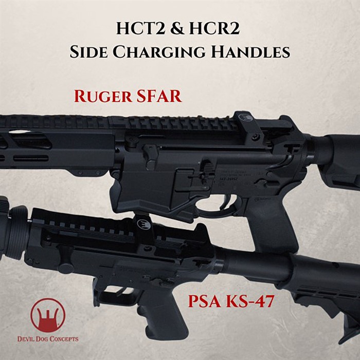 DEVIL DOG CONCPETS HCT2 G2 HARD CHARGER TACTICAL SIDE-CHARGING HANDLE W/TACTICAL PULL HANDLE FOR AR-15 HCT2 (Hard Charger® Tactical – Gen 2) with Tactical Handle: for AR-15 Forged/Billet, SFAR & KS-47 No longer do you have to rebuild your upper receiver or buy a new rifle to have the side charging capability!! Turn your rifle in to a Side Charger without having to rebuild or modify it. Simply swap out the charging handle and install the Hard Charger. Takes a minute or less and you are up and running! FEATURES Devil Dog Concepts’ Side Charging Handle System = Ergonomically Beneficial Multiple Ways to Charge Interchangeable from Rifle to Rifle Non Reciprocating Removes Stress on Roll Pin Reduces Torque on Charging Handle Field Strippable – Gross Motor Skills Plenty of Room for Mounting Optics and Sights The HCT2 (Hard Charger® Tactical Gen 2) Mounts to the 3rd Picatinny Rail. This new model is designed to work on Standard, Forged, Mil-Spec Type Upper Receivers & Billet Rifles. Will also work on Ruger SFAR & PSA KS-47 This design mounts between a Back Up Sight and a forward mounted Optic. The adjustable tip allows for mounting on varying width Billet Receivers as well as the Ruger SFAR and PSA KS-47. SPECS For Forged & Billet AR-15s, and also Ruger SFAR & PSA KS-47 Made from 7075 Aluminum Anodized Black, and Steel Weighs 6oz