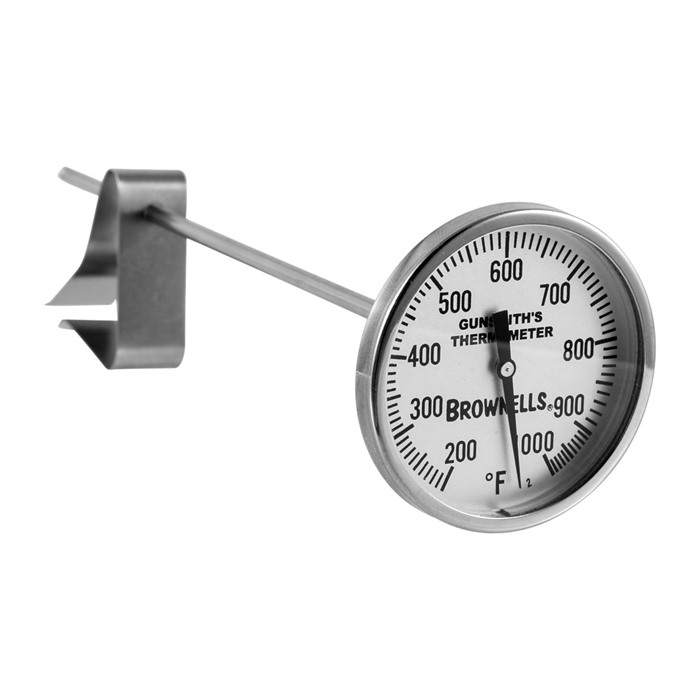 BROWNELL’S HEAT-TREATED THERMOMETER The Brownells Heat-Treat Thermometer is a precision instrument designed to accurately measure temperatures ranging from 200°F to 1000°F, making it ideal for processes like Nitre Blue™ bluing. Featuring a 2-inch dial and an 8-inch stainless steel stem, it requires immersion of at least 2 inches for precise readings. The hermetically sealed design ensures durability and reliability in various heat-treating applications. Key Features: Wide Temperature Range: Measures from 200°F to 1000°F, accommodating a variety of heat-treating needs. Precision Accuracy: Guaranteed accurate to within half of 1%, providing reliable temperature readings. Durable Construction: Crafted from 304 stainless steel with a hermetically sealed design for longevity. User-Friendly Design: The 2-inch dial allows for easy reading, and the 8-inch stem is suitable for various applications, requiring at least 2 inches of immersion. Specifications: Temperature Range: 200°F to 1000°F Dial Diameter: 2 inches (5.1 cm) Stem Length: 8 inches (20.3 cm) Material: 304 stainless steel Accuracy: ±0.5% Customer Insights: Our customers appreciate the Brownells Heat-Treat Thermometer for its accuracy and reliability in heat-treating applications. Special note to its effectiveness in Nitre bluing processes, highlighting its consistent performance over years of use. The thermometer's ability to maintain precise temperatures is appreciated by professionals and hobbyists alike, making it a valuable addition to any workshop. Incorporating the Brownells Heat-Treat Thermometer into your heat-treating setup ensures precise temperature control, enhancing the quality and consistency of your metal treatment processes.
