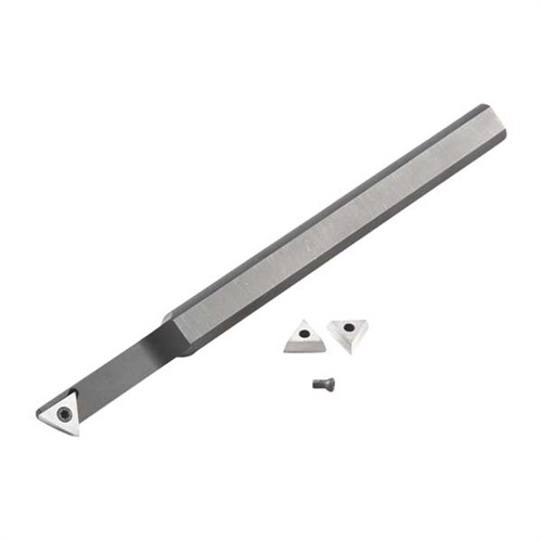 Våra verktygskit inkluderar härdade stålverktygshållare och hög hastighetsstålinsatser för snurrning, gängning, profilering och avskärning. Insatserna är T-15 High Speed Steel (HSS) härdade till Rc 65-67 och är sedan slipade på alla sidor.