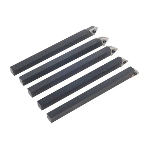 Verktyghållarna och borrstängerna är CNC-bearbetade från 4140/4142 stålstång, härdade till Rc 48-50 och sedan belagda med svart oxid för att motstå korrosion. Setet inkluderar fem ¼" fyrkantiga verktyghållare och sex insatser, inklusive en reservinsats.