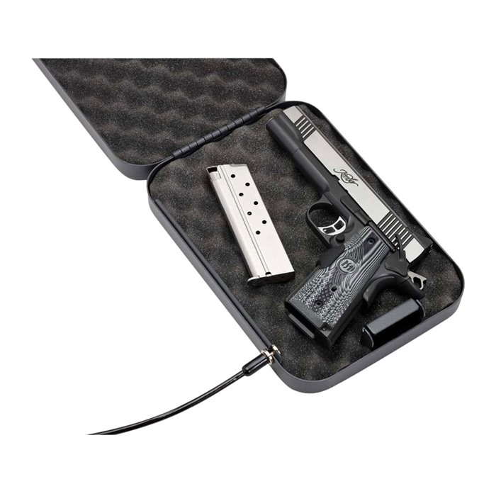 Have a handgun or some small, special objects that you want to hide away from prying eyes? For those on a budget, the Hornady Security Lock Box offers a dependable method of preventing immediate access by grab-and-go thieves. Made using the same 16-gauge steel construction as the company's higher-end lock boxes, the Hornady Security Lock Box will withstand pry attempts and other punishment with ease. An included heavy-duty security cable allows users to attach the box to a bed frame or other hard-to-move object to avoid thieves snatching the box. The cable is rated to take up to 1,500 pounds of force. Color: black Height: 1.72 inches Width: 6.5 inches Length: 9.5 inches Each Security Lock Box is locked into place with a steel barrel lock and ships with two keys. The interior of the box is coated with foam, protecting any object inside from damage.
