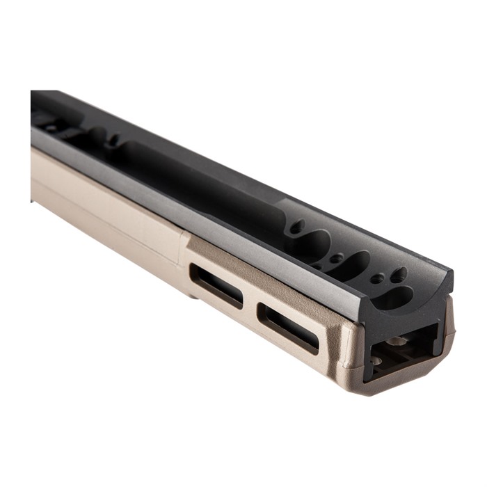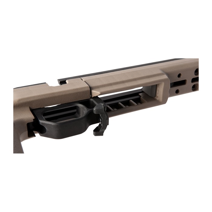 Kinetic Research Group Howa 1500 Bravo Chassis har en ryggrad gjord av bearbetad aluminium som sträcker sig längs hela längden av kolven, vilket ger den styvhet som säkerställer samma prestanda som vanligtvis finns med anpassade bäddningar. Resten av kolven är tillverkad av förstärkt polymer för hållbarhet.