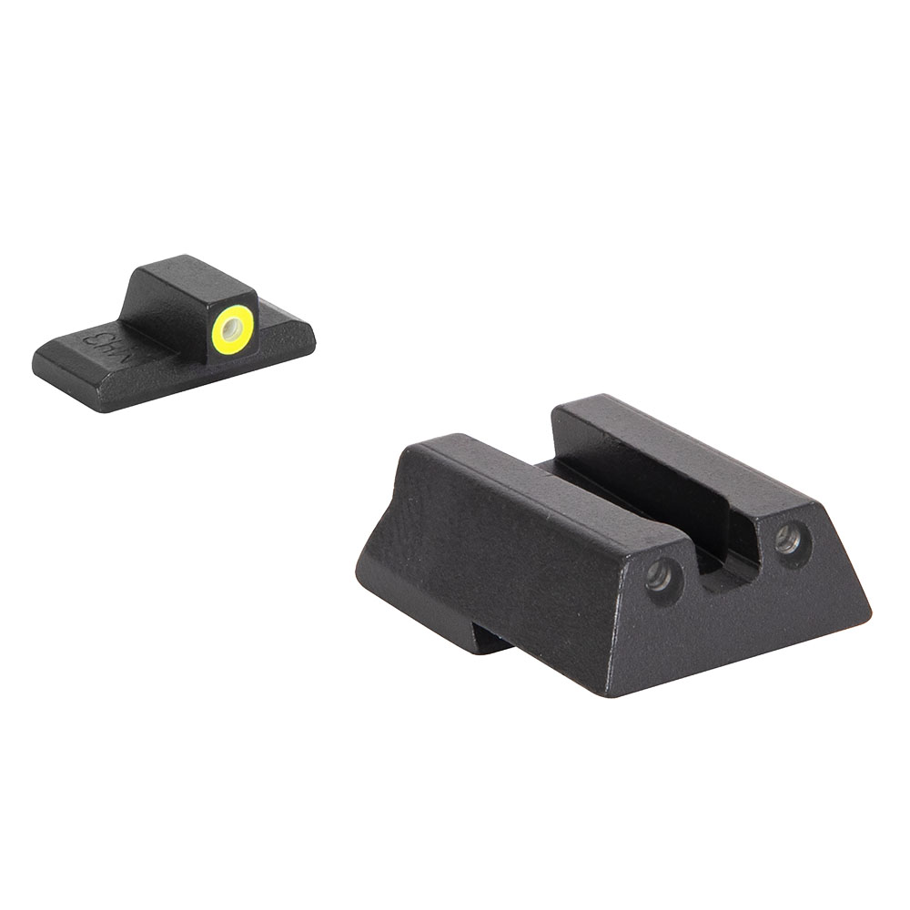 MEPRO Hyper-Bright™ fasta dag- och nattsikten erbjuder den mest pålitliga belysningen för dag eller natt. Mepro Hyper-Bright™ fasta siktar har en extremt ljusstark fluorescerande kontrastfärgad ring i grönt eller orange för snabb målinriktning på dagen. Den gula ringalternativet är det enda alternativet med fosforescerande färg som laddas med ljus och lyser i svagt ljus under en kort tid i samband med tritium. Som ett resultat framstår både bak- och framsiktets tritiumkällor som gröna i svagt ljus och nattetid.