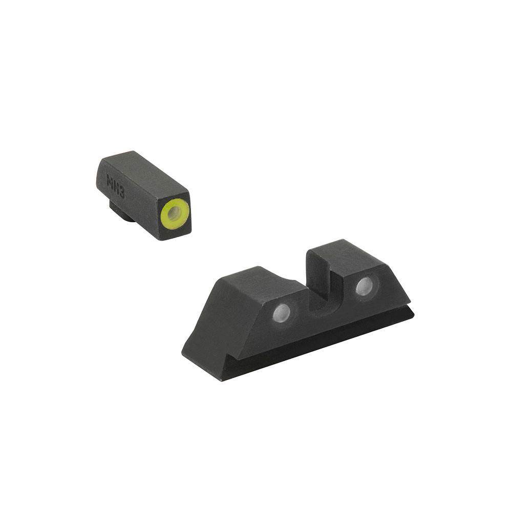 MEPRO Hyper-Bright™ fasta dag- och nattsikten erbjuder den mest pålitliga belysningen för dag eller natt. Mepro Hyper-Bright™ fasta siktar har en extremt ljusstark fluorescerande kontrastfärgad ring i grönt eller orange för snabb målfångst under dagen. Gult ringalternativ är det enda alternativet med fosforescerande färg som laddas med ljus och lyser i svagt ljus under en kort tid tillsammans med tritium. Som ett resultat framträder både bak- och framsiktets tritiumkällor gröna i svagt ljus och nattetid.