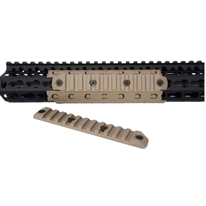 Rail section is made of Lightweight Impact Resistant Polymer. Mounting hardware is made of Corrosion Resistant Stainless Steel Made to the Mil-Standard 1913 Picatinny Arsenal Specifications. Available is three Lengths: 3-inch (5 slot), 4-inch (7 slot) and 5.5-inch (11 slot) Features a Snag resistant design, while retaining Mil-Standards specs. Self-contained assembly, eliminates the possible loss of mounting hardware. Fits ALL KeyMod interface mounting surfaces.