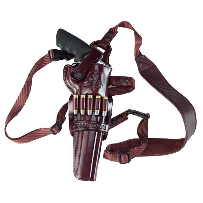 Designed to keep a large hunting handgun both comfortable and accessible, Galco s new Kodiak"! Shoulder Holster carries a magnum revolver diagonally across the torso. Using the same principles as modern backpacks, a padded shoulder strap is used in conjunction with a torso strap that allows for instant adjustments throughout a day spent afield. As the torso strap is tightened, weight is shifted off the shoulder strap, allowing for a full day of comfortable field carry. Actual placement and angle of the Kodiak holster on the front torso can be easily changed throughout the day to accommodate most field activities, including driving ATV s and trucks, without interfering with the normal range of motion. No screws or tools are needed to make adjustments to accommodate heavy winter clothes, wear under the coat, or simply over a shirt in warm weather. Does not include ammo bandolier.