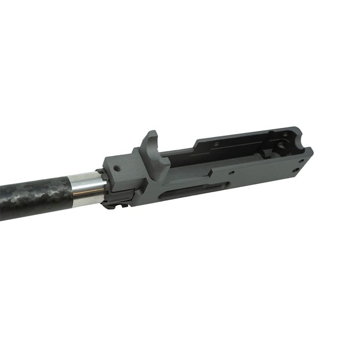 LDR, eller Long Distance Ready, har en integrerad 20 MOA Picatinny rail som är maskinbearbetad i toppen av mottagaren, redo att montera det sikte du väljer. Pipa på 16,1” har en kolfiberinpackning över en 416 rostfri stålinre. Munningsgängen är ½-28. Mottagaren kommer utan delar förutom den monterade pipan och är tillverkad av 6061 aluminium med en hård klar anodiserad finish.