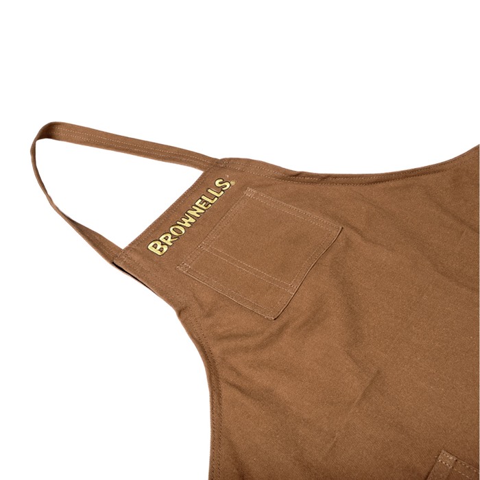 Krok-och-loop-stängningen på halsremmen låter dig justera förklädet för en säker passform och maximal täckning. Brownells-logotypen är smakfullt broderad på framsidan för att låta hela världen veta vem din favoritleverantör av skjutvapen är.