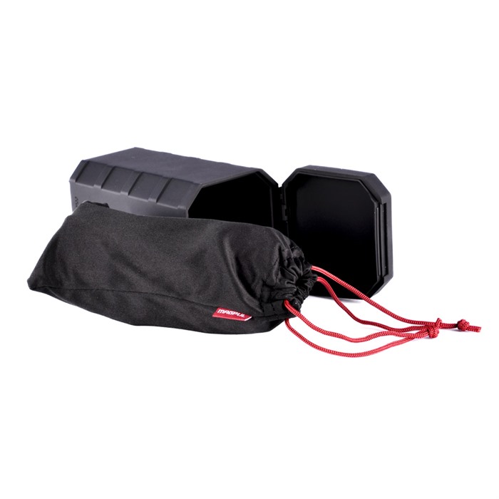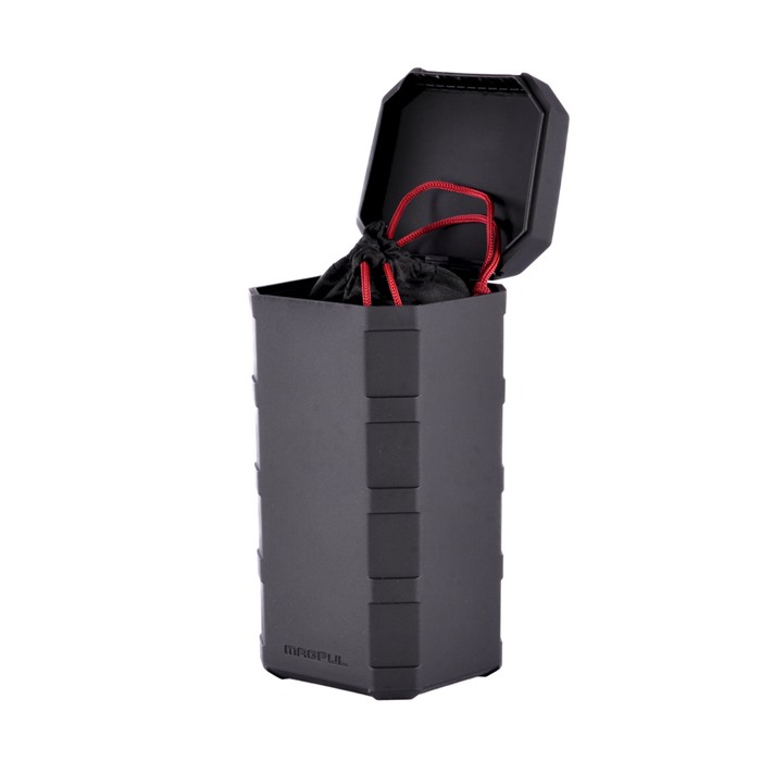 Kommer med ett svart stort DAKA Can förvaringsfodral och en Magpul Eyewear Bag tillverkad av linsvänligt rengöringsmaterial.