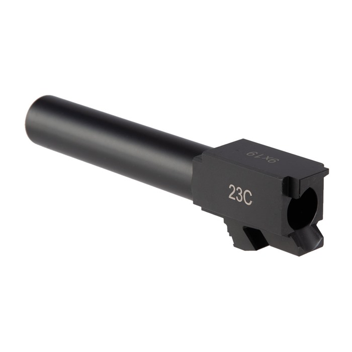 The Brownells Match-Grade Conversion Barrel enables you to switch your .40 S&W chambered Glock® 23 to shoot 9mm Luger (9x19mm) ammo AND also improve its accuracy potential at the same time. It fits Gen1 through Gen4 variants of the Glock® 23, and will be a drop-in install on most guns. Each conversion barrel is machined from 416R stainless steel alloy to precise dimensions to ensure a tight lockup and long service life. Button-rifled with 1-10" right-hand, 6-groove rifling that is compatible with inexpensive "practice" ammo that has non-jacketed bullets. The hard Black Nitride finish resists surface wear and stops in its tracks whatever corrosion might try to challenge the stainless steel. Available with either a Plain muzzle or Threaded (1/2"-28 tpi) to enable installation of a compensator or sound suppressor. Both have an 11-degree target crown, and each is laser engraved with the chambering and the Glock model it fits. Fits Glock® 23 Gen1 thru Gen4 G19-compatible 9mm magazine required to complete the conversion (not included) Extra-strong 416R stainless steel alloy Matte black Nitride anti-corrosion finish Button-rifled 1-10" twist Threaded model has 1/2"-28 tpi threads If you have an old Glock® 23 with a shot-out factory barrel, give it a new lease on life. Swap in a Brownells match-grade conversion barrel and enjoy the gentler recoil AND lower cost of 9mm ammo. Remember: to complete the conversion, you will need to add a Glock 19 compatible 9mm magazine.