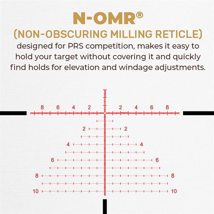 N-OMR® Systemet (Non-Obscuring Milling Reticle® System) har ett öppet centrum huvudkors som gör att du kan sikta på ditt mål utan att täcka det. En extra fördel är den tunna dubbellinjen som ökar synligheten av korshåret vid låg förstoring. Denna typ av retikel är utmärkt för skjutdiscipliner som kräver snabba skott under tidspress, eller när snabba uppföljningsskott behövs.