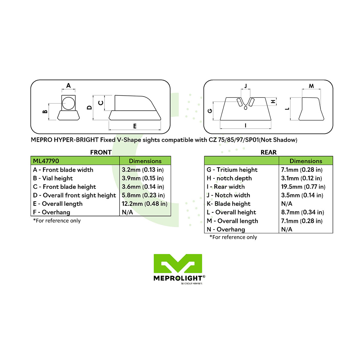 MEPRO HYPER-BRIGHT V-SIGHT FIXED SETS är världens ljusstarkaste handeldvapen sikte, oavsett ljusförhållanden. Med tritium som är speciellt formulerat för att ge en branschledande briljans från dagsljus till midnatt.