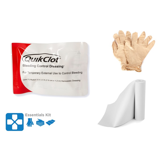 - ESSENTIAL INCLUDES: Trauma Gloves (Rolled 1x Pair), Quikclot Bleeding Control Dressing (1x), och en Pressure Device (1x)