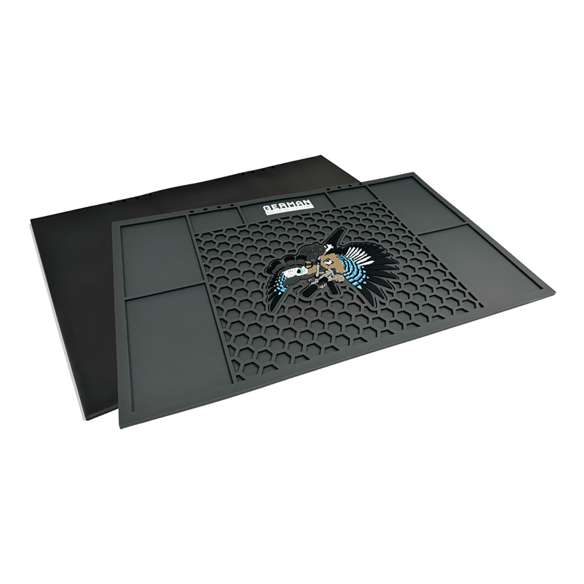 Maintenance Mat – Pistol är designad för seriös vård av skjutvapen – oavsett om du rengör pistoler, revolvrar eller andra kompakta vapen. Tillverkad av hållbar PVC och med praktiska uppgraderingar, håller den dina verktyg organiserade och din arbetsyta ren, samtidigt som den stolt visar upp Eurasian Jay, maskoten för German Tactical Systems.