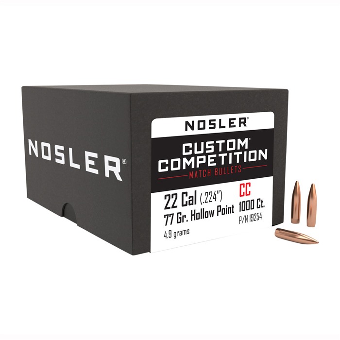 CUSTOM COMPETITION 22 CALIBER (0.224") HOLLOW POINT BOAT TAIL RIFLE BULLETS Blending the accuracy of Nosler Custom Competition bullet jackets with our own ultra-precise, lead-alloy cores, we’ve created one of the most accurate match rifle bullets on the market. The hollow point provides a small meplat for reduced drag and increased aerodynamic efficiency while the pronounced boat-tail design provides exceptional flight characteristics over a wide range of velocities. Engineered to exhibit unmatched accuracy, the custom quality jacket form-fits the lead-alloy core for maximum bullet stability and balance. Hand-inspected for quality assurance, Nosler Custom Competition bullets rival all others on the range. FEATURES: Hollow Point Custom Quality Jacket Form-Fitted, Lead-Alloy Core Pronounced Boat-Tail Design