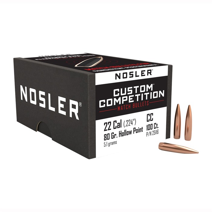 CUSTOM COMPETITION 22 CALIBER (0.224") HOLLOW POINT BOAT TAIL RIFLE BULLETS Blending the accuracy of Nosler Custom Competition bullet jackets with our own ultra-precise, lead-alloy cores, we’ve created one of the most accurate match rifle bullets on the market. The hollow point provides a small meplat for reduced drag and increased aerodynamic efficiency while the pronounced boat-tail design provides exceptional flight characteristics over a wide range of velocities. Engineered to exhibit unmatched accuracy, the custom quality jacket form-fits the lead-alloy core for maximum bullet stability and balance. Hand-inspected for quality assurance, Nosler Custom Competition bullets rival all others on the range. FEATURES: Hollow Point Custom Quality Jacket Form-Fitted, Lead-Alloy Core Pronounced Boat-Tail Design