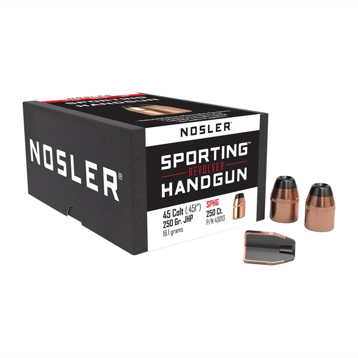 NOSLER SPORTING HANDGUN 45 CALIBER (0.451") JACKETED HOLLOW POINT REVOLVER BULLETS Whether you punch paper, shoot steel or use your handgun for hunting, Nosler ensures you have the very finest in accuracy, consistency and overall quality. Designed to expand rapidly upon impact, the pure lead core is copper-alloy jacketed for maximum bullet stability and balance while further enhancing accuracy. The bullet’s well-defined cannelure holds the jacket and core together and allows a tight crimp, eliminating bullet movement within the case. Like our premium rifle bullets, Nosler hand-inspects all Sporting Handgun bullets for quality assurance and then polishes them to a bright finish.