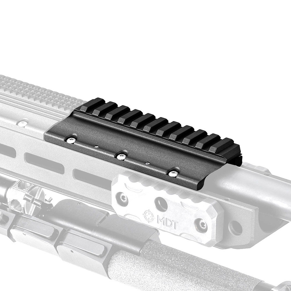The MDT ACC Elite NV Bridge is a Picatinny rail that securely attaches to the top of the forend, providing versatile mounting options for night vision, thermal imaging, prism/periscope, or other devices. Additionally, the NV Bridge assists in reducing mirage effects.