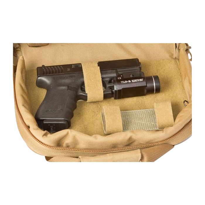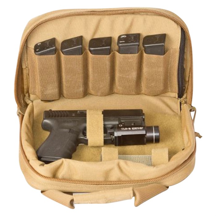 Detta kompakta, men fullt utrustade pistolfodral accepterar handeldvapen eller annan utrustning. Fem elastiska magasinöppningar och en helt Velcro-loopad inre panel gör det enkelt att transportera reservmagasin, pistol, dämpare eller annan utrustning till skjutbanan.