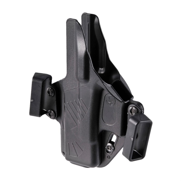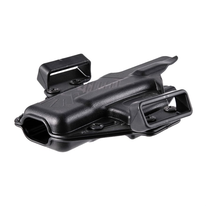 Kroppsnära kurvatur av denna holster uppnås med hjälp av modulära bältesöglor. Varje holster inkluderar tre par av 1,5” bältesöglor (LH 10 graders lutning, RH 10 graders lutning och ambi 0 graders lutning), vilket gör att användaren kan konfigurera den ambidextrösa holsterkroppen för vänster- eller högeranvändning, med antingen 0-graders eller 10-graders lutning.