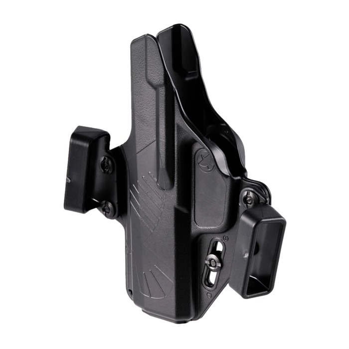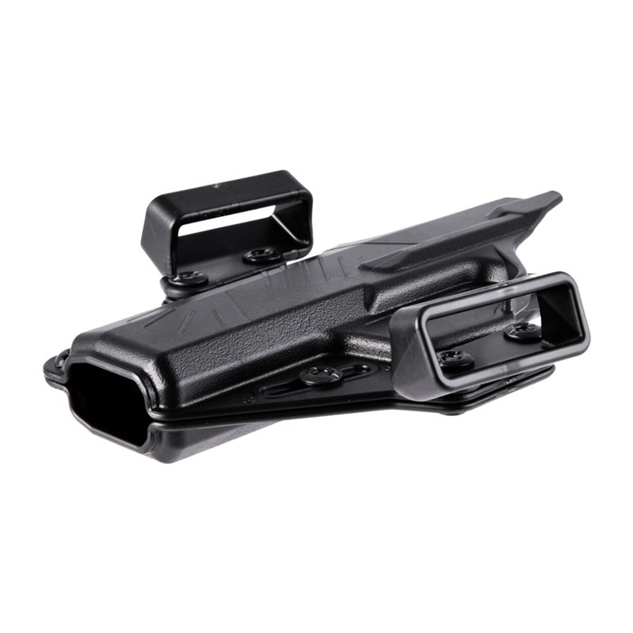 Kroppsnära kurvatur i detta holster uppnås med hjälp av modulära bältesöglor. Varje holster inkluderar tre par 1.5” bältesöglor (LH 10 graders vinkel, RH 10 graders vinkel och ambi 0 graders vinkel), vilket gör att slutanvändaren kan konfigurera det ambidextrösa holsterkroppen för vänster- eller högeranvändning, med antingen 0-graders eller 10-graders vinkel.
