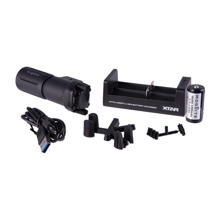 The PL350 is the much-anticipated handgun light that combines modularity and compatibility from Modlite. Utilizing two rail keys (included) the PL350 has the ability to fit both universal and 1913 handgun rails. And with a “out the front” battery compartment you don’t need to remove the light to change out the battery. Speaking of batteries, the PL350 is powered by a single, rechargeable 18350 (one battery included with light) that is both well known and well regarded by currently users of Modlite. The PL350 is available with 4 different options for light heads. The PLHv2, the OKW, the IR 940, and the IR-850. PLHv2 If you're looking for the best overall output and throw this is the package you want. Approximately 1350 out the front lumens and candela is approximately 54,000. It is an excellent overall light head good for indoor or outdoor use. OWK This light head is best suited for situations where extreme throw is needed. Approximately 680 out the front lumens and candela is approximately 69,000. This light is an excellent choice for anyone needing maximum throw. IR 940 This is a dedicated IR illumination head that is designed to output IR light in the 940nm IR spectrum. The reflector is designed to deliver a good amount of spill and a well defined hot spot at distances up to 75 yards depending on atmospheric conditions. Approximately 500mW IR output. IR 850 This is a dedicated IR illumination head that is designed to output IR light in the 850nm IR spectrum. The reflector is designed to deliver a good amount of spill and a well defined hot spot at distances up to 300 yards depending on atmospheric conditions. Approximately 1100mW IR output. Runtimes vary between models. Each PL350 includes a single 18350 rechargeable battery, a charger, and PHLster ARC Enhanced Switches which allow for end-user modularity