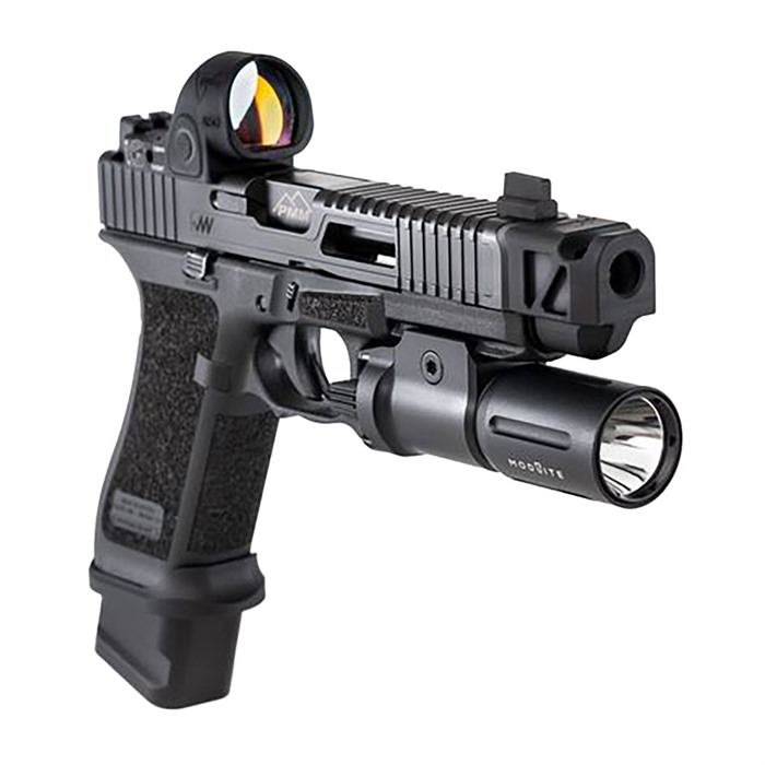 The PL350 is the much-anticipated handgun light that combines modularity and compatibility from Modlite. Utilizing two rail keys (included) the PL350 has the ability to fit both universal and 1913 handgun rails. And with a “out the front” battery compartment you don’t need to remove the light to change out the battery. Speaking of batteries, the PL350 is powered by a single, rechargeable 18350 (one battery included with light) that is both well known and well regarded by currently users of Modlite. The PL350 is available with 4 different options for light heads. The PLHv2, the OKW, the IR 940, and the IR-850. PLHv2 If you're looking for the best overall output and throw this is the package you want. Approximately 1350 out the front lumens and candela is approximately 54,000. It is an excellent overall light head good for indoor or outdoor use. OWK This light head is best suited for situations where extreme throw is needed. Approximately 680 out the front lumens and candela is approximately 69,000. This light is an excellent choice for anyone needing maximum throw. IR 940 This is a dedicated IR illumination head that is designed to output IR light in the 940nm IR spectrum. The reflector is designed to deliver a good amount of spill and a well defined hot spot at distances up to 75 yards depending on atmospheric conditions. Approximately 500mW IR output. IR 850 This is a dedicated IR illumination head that is designed to output IR light in the 850nm IR spectrum. The reflector is designed to deliver a good amount of spill and a well defined hot spot at distances up to 300 yards depending on atmospheric conditions. Approximately 1100mW IR output. Runtimes vary between models. Each PL350 includes a single 18350 rechargeable battery, a charger, and PHLster ARC Enhanced Switches which allow for end-user modularity