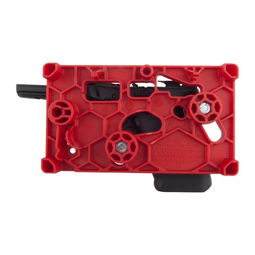Retaining slots på varje sida av blocket håller strikern, vilket gör borttagning och installation av strikerspringan till en enkel uppgift. En sida är för 45 striker och den andra är för 9/40/357 striker. Flyttbara bossar är lätt justerbara för att positionera ramar snabbt och enkelt. Upphöjda väggar på varje sida av blocket placerar trigger bar inom triggen för enkel triggerbyte.