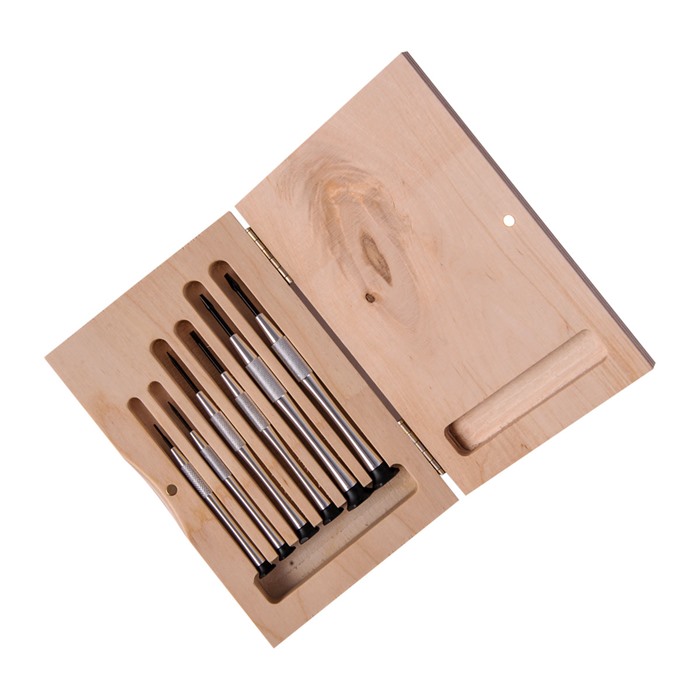 Denna skruvmejselset kommer i en fällbar trälåda och är av mycket hög kvalitet. Skruvmejslarna har aluminiumhandtag som är ribbade för ett säkert grepp.