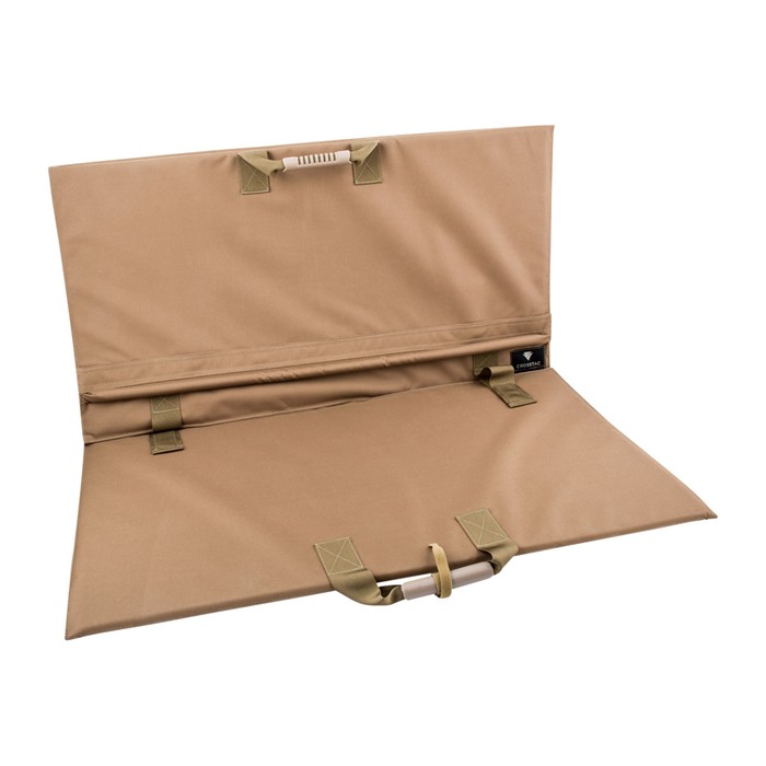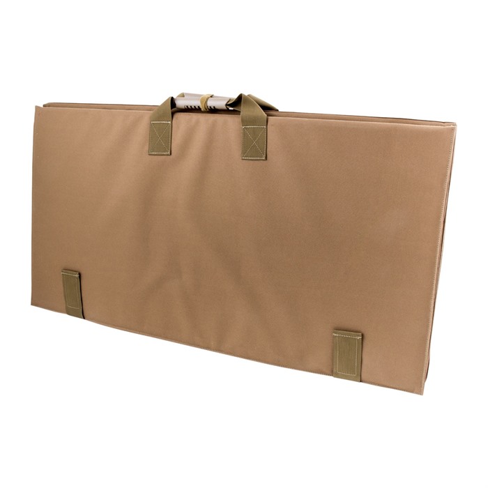 Den överdimensionerade längden på 79" rymmer även de längsta skyttarna. Den fyrdelade designen gör att du kan förvara ditt vapen inuti den hopvikta mattan under transport i fält. Stora handtag och hållande remmar konstruerade av 2" bred webb med kardborrefästen håller allt på plats och lätt att transportera. Den inbyggda, 1" höga skumlappen fram på mattan ger ett stopp för att förhindra framåtrörelse av bipoden för snabba uppföljningsskott.