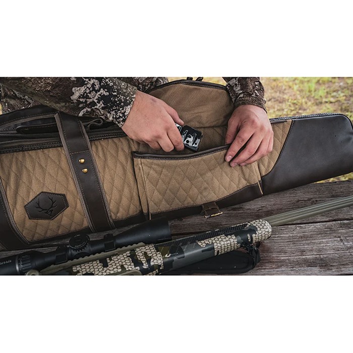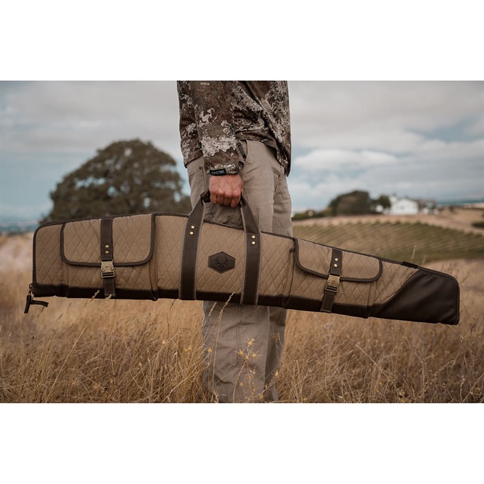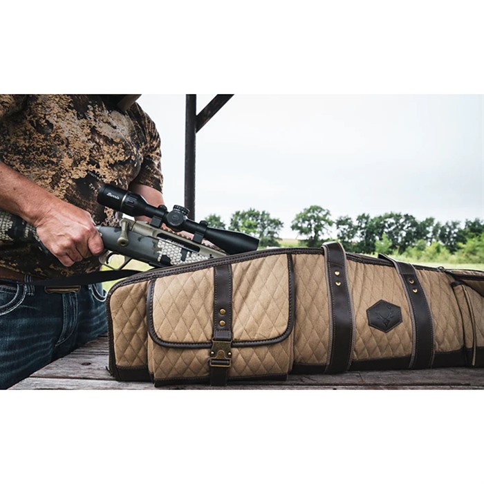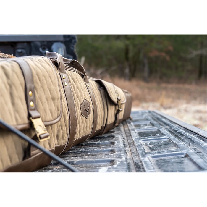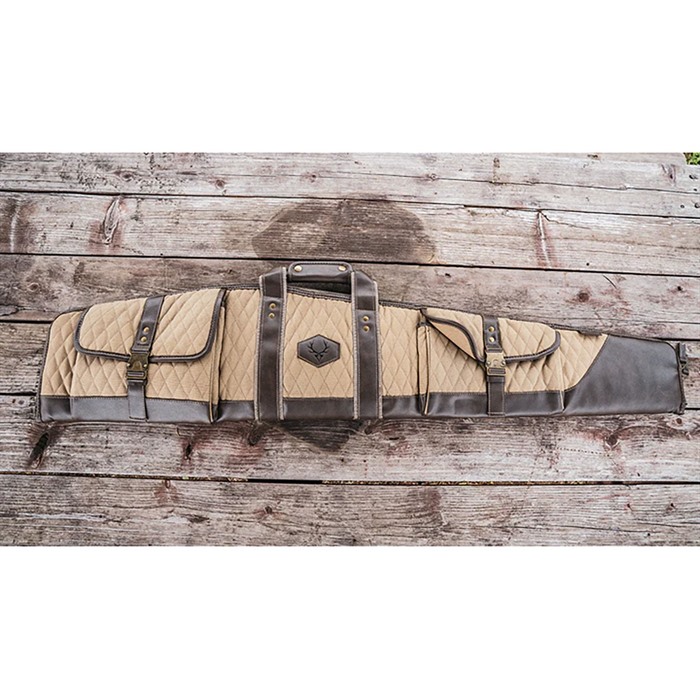 PRESIDENT SERIES RIFLE CASE Experience the New Evolution Outdoor President Series RIFLE CASE.? ?This is truly a PREMIUM GUN CASE. With its antique brass features & dual compound foam, not only does this case look good but will keep your firearm fully protected. It has dual accessory pockets & fits scoped rifles.? ?This is a fantastic, Premium QUILTED RIFLE CASE for your best firearm.?? FEATURES: Quality firearm protection Quilted 12 oz. cotton duck canvas Brown suede lining Leatherette flap pocket with metal buckles Antique brass hardware Wrap around carry handle supports firearm Dual compound foam for maximum impact resistance Premium leatherette trim and accents Tall Profile Fits Scoped Rifles SPECIFCATIONS: Size: 48” Length (Inner Dimensions: 46" Length)