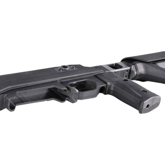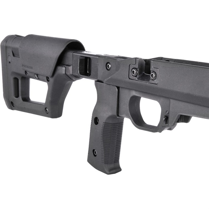 Maintaining the most important features of Magpul’s original Pro 700L, the Pro 700L Lite strikes a balance between features and cost without sacrificing performance. As the name suggests, the Pro 700L Lite blends the original Pro 700L Chassis and the PRS Lite stock to create a simplified rear end with a strong foundation – passing on the value and weight savings to you. The streamlined design weighs in at 4.5 pounds, a full pound less than its predecessor, but still packs a complete set of features that elevate your rifle’s performance. The Pro 700L Lite provides an optimized shooter interface with 0.8” of comb height and 1.4” of LOP adjustments (LOP measures 13.0” -14.4”). The low-profile rubber butt-pad is adjustable for height and cant, providing an extremely stable interface with the shooter’s shoulder. Sling attachment options include an ambidextrous 1.25” footman’s loop, a reversible QD sling swivel cup, and space for another optional QD sling swivel cup. The injection-molded polymer grip has a 5-degree forward edge sweep and enlarged palm swell with a 7-degree aft edge sweep for enhanced user comfort, and it includes a .75” fore/ aft adjustment range using a common hex wrench. An additional grip is included, offering a more aggressive sweep and enlarged palm swell for the shooter who is more inclined to a less vertical grip interface (8-degree forward / 20-degree aft edge sweep). The Pro 700L Lite surrounds its billet-aluminum chassis with Magpul polymer for enhanced ergonomics, strength, and sound mitigation. Built around the user, it is fully ambidextrous at the swap of a bolt retainer plate, and the vertical grip can be adjusted for various trigger reaches. The included large trigger guard can accommodate usage with gloves and aftermarket triggers. The AICS-pattern magazine well features an ambidextrous mag release and has a front barricade stop to prevent the rifle from resting on the magazine when using barricade support. Up front, there are numerous M-LOK slots (left-6 / right-6 / bottom-7) allowing you to mount whatever accessories your loadout calls for. Extremely versatile and adaptable, the Pro 700L Lite turns your long action, 700-pattern rifle into the perfect bolt action precision machine. FEATURES Fully machined aluminum fore end and bedding block AICS compatible bottom metal Vertical grip with adjustment for trigger reach Large trigger guard accommodates gloves and aftermarket triggers Compatible with left and right-handed actions Comb height, LOP, and butt pad adjustment from PRS Lite Injection-molded polymer grip with 5-degree forward edge sweep and enlarged palm swell with 7-degree aft edge sweep for enhanced user comfort combined with a .75” fore/aft adjustment range using a common hex wrench Additional grip option included with a more aggressive sweep and enlarged palm swell for the shooter that is more inclined to a less vertical grip interface (8 degree forward / 20-degree aft edge sweep) Multiple sling attachment points (an ambidextrous 1.25” footman’s loop, a reversible QD sling swivel cup, and a space for another optional QD sling swivel cup Made in the USA COMPATIBILITY Compatible with Remington® 700 Long Action and other Remington 700 Long Action footprints. Buttstock/cheek riser must be removed on the Pro 700L Lite before the user can remove the bolt from the action. Ships with MAG698 (Magnum Long Action AICS 5-round PMAG)