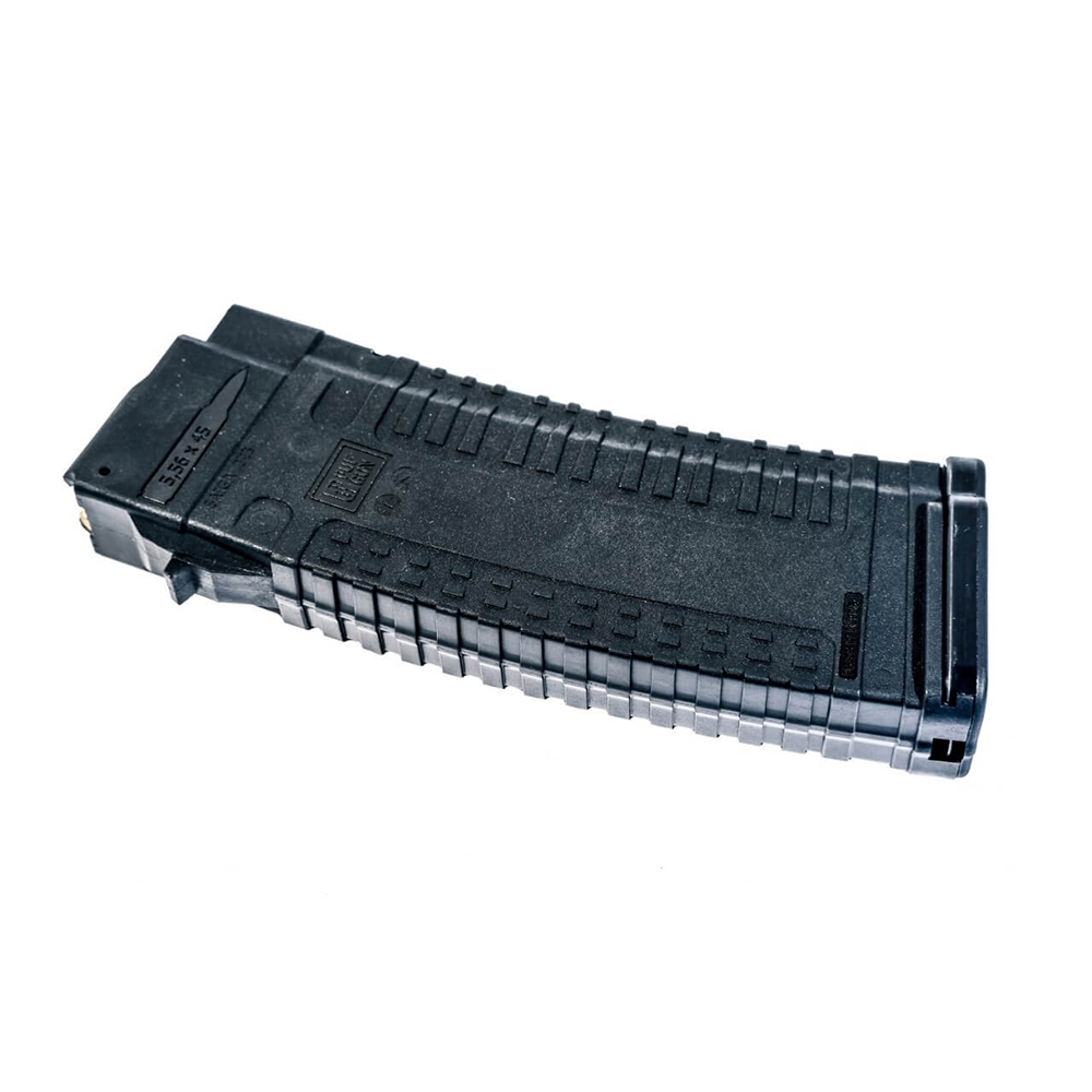 Denna magasin är designad för 30 skott. Utöver den grova ytan är de yttre väggarna täckta med ett mönster som förhindrar att den glider ur händerna. Magasinet är enkelt att demontera. Med en försänkt utlösningsknapp på baklocket kan du enkelt ta bort det och få tillgång för rengöring och underhåll.
