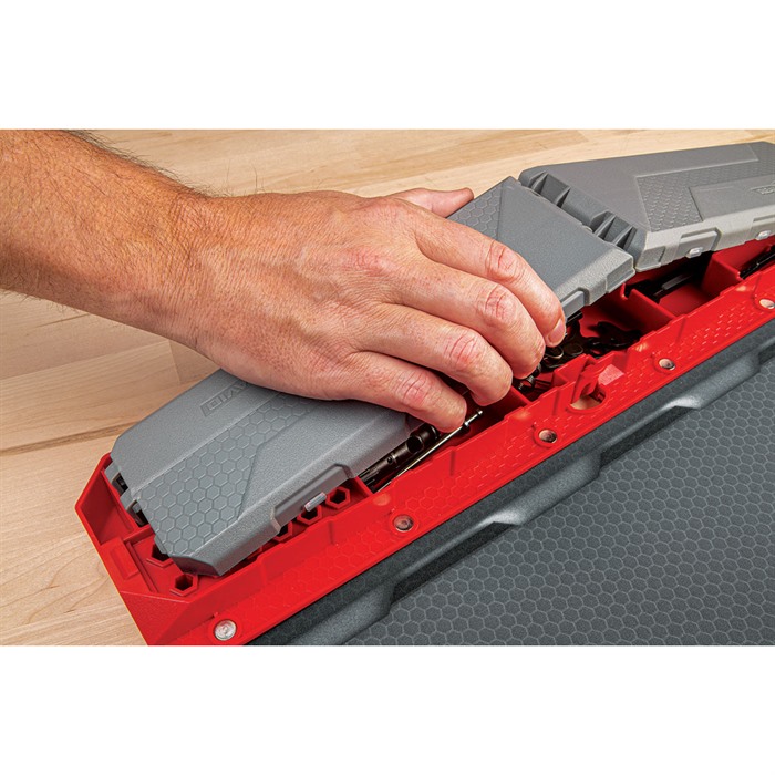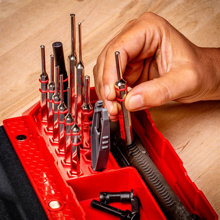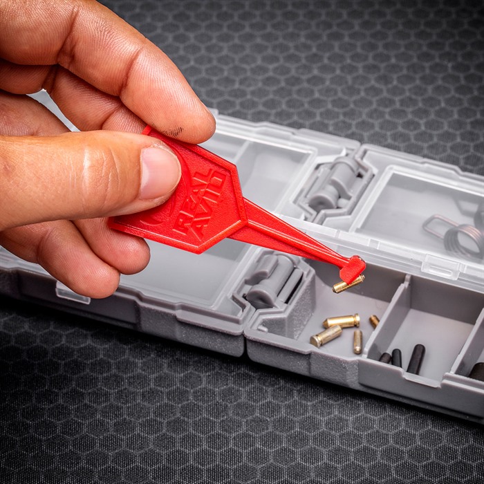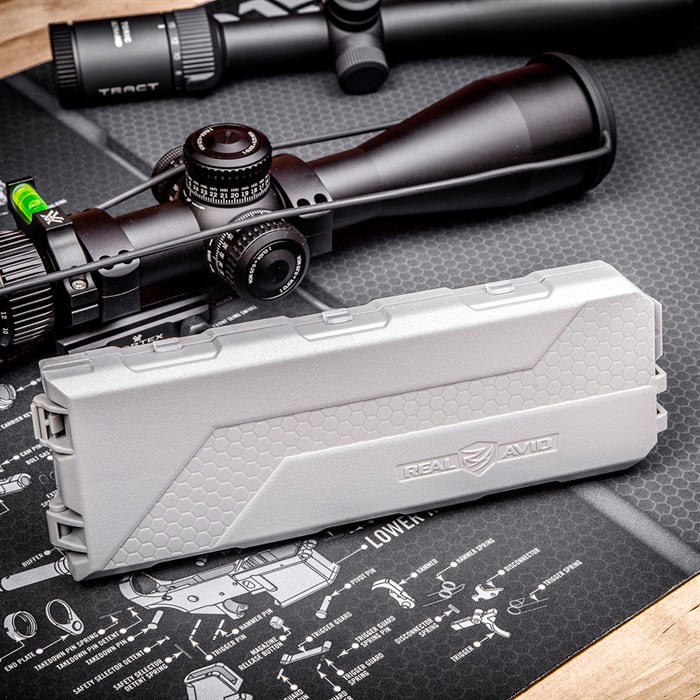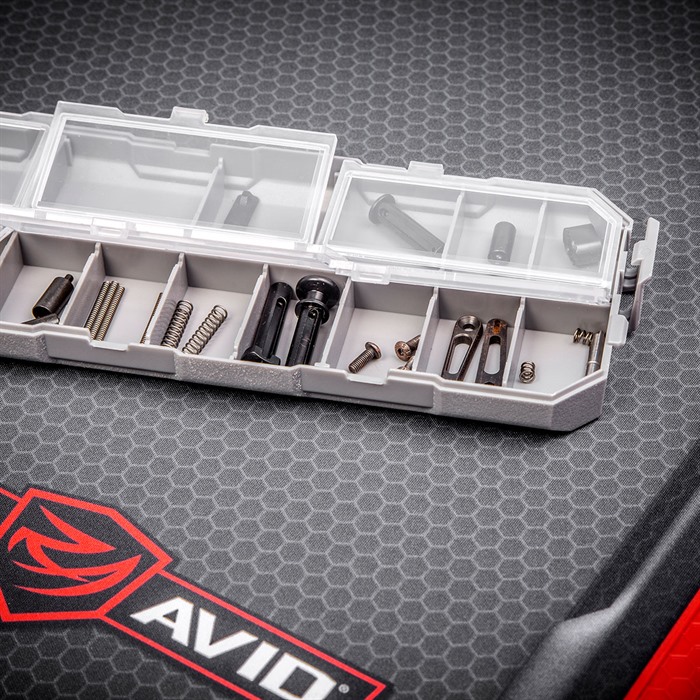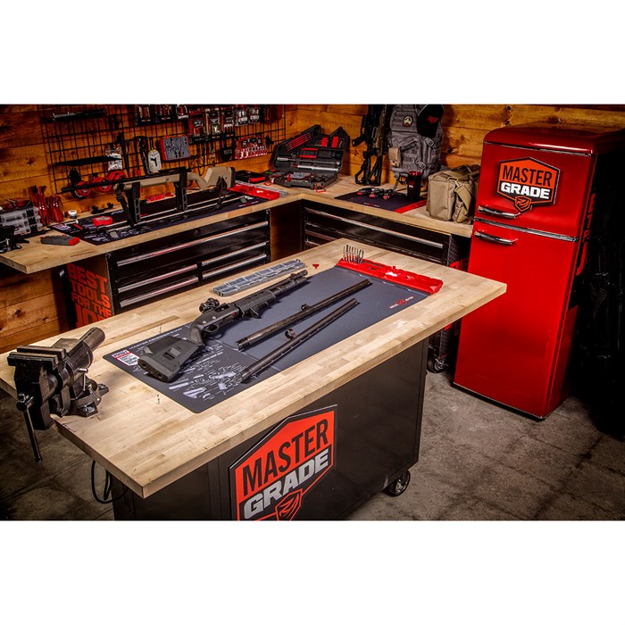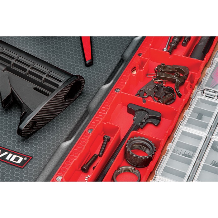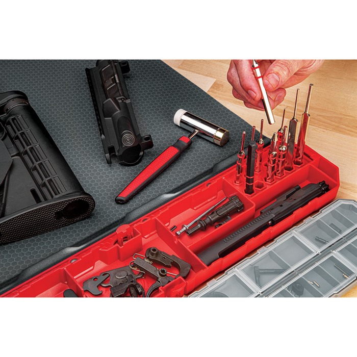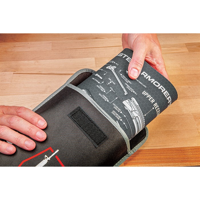 The Master Armorer’s Mat is the ultimate solution for your gun building project. This massive mat will protect your large gun parts while the added organization trays will hold every medium and small component, making sure you don’t lose any parts in the process. This isn’t just a mat, it’s the future of gun building.Features: - Expansive non-skid backed work area - Enlarged detailed AR15 parts view - Padded, oil and grease resistant surface - Integrated parts and tool storage tray - Detachable small parts storage case.